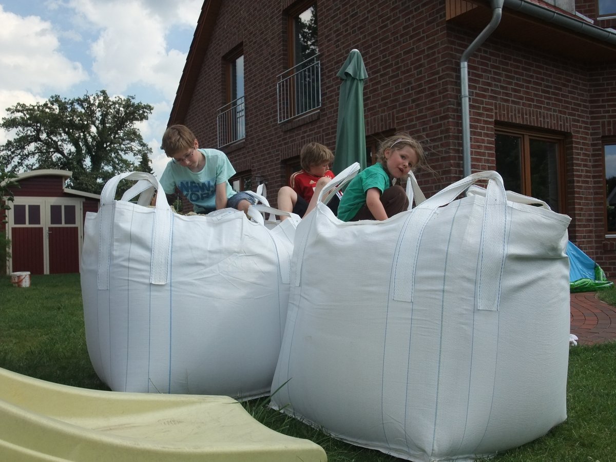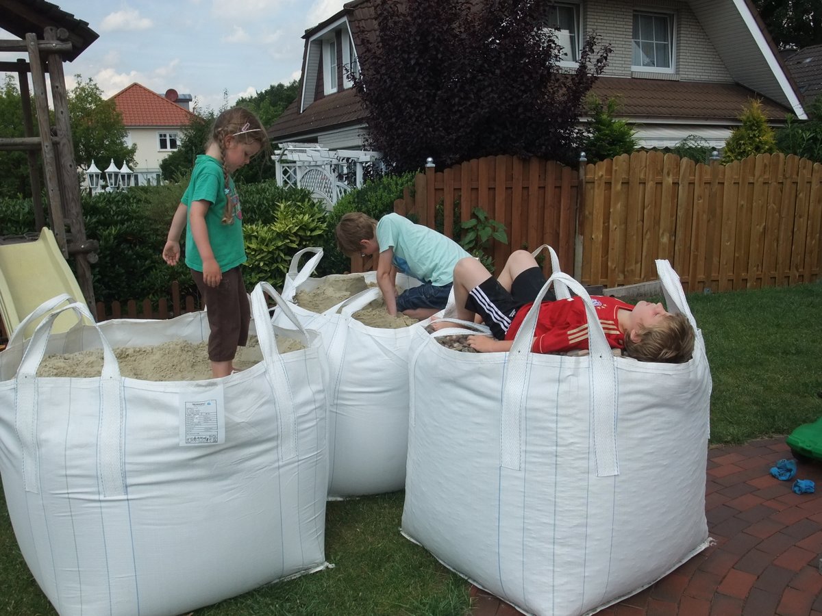 Freitag wurden 2 Kubikmeter Sand und 1 Kubikmeter Drainagekies geliefert. Die Kinder hatten Spaß an den BigBags. Aber dann war arbeiten angesagt, der Sand musste in den Sandkasten und der Kies in den Graben zu unserer Nachbarin hin: