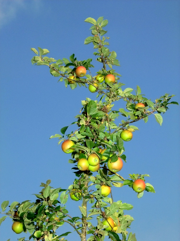 Der Apfelbaum trägt viele Früchte, aber sie sind noch nicht ganz reif und Wespen und anderes Insektengetier hat den ein oder anderen Apfel auch schon angestochen: